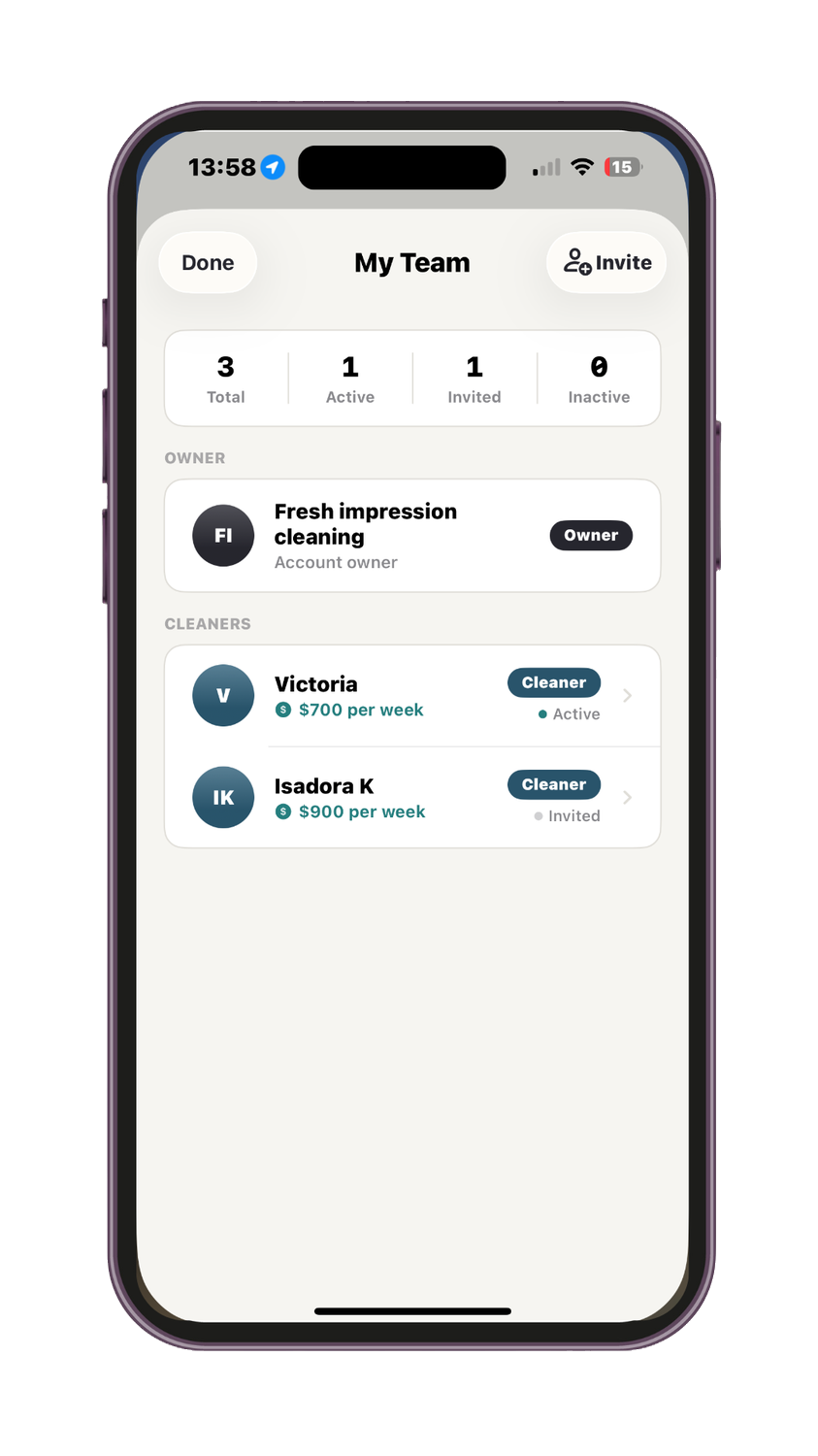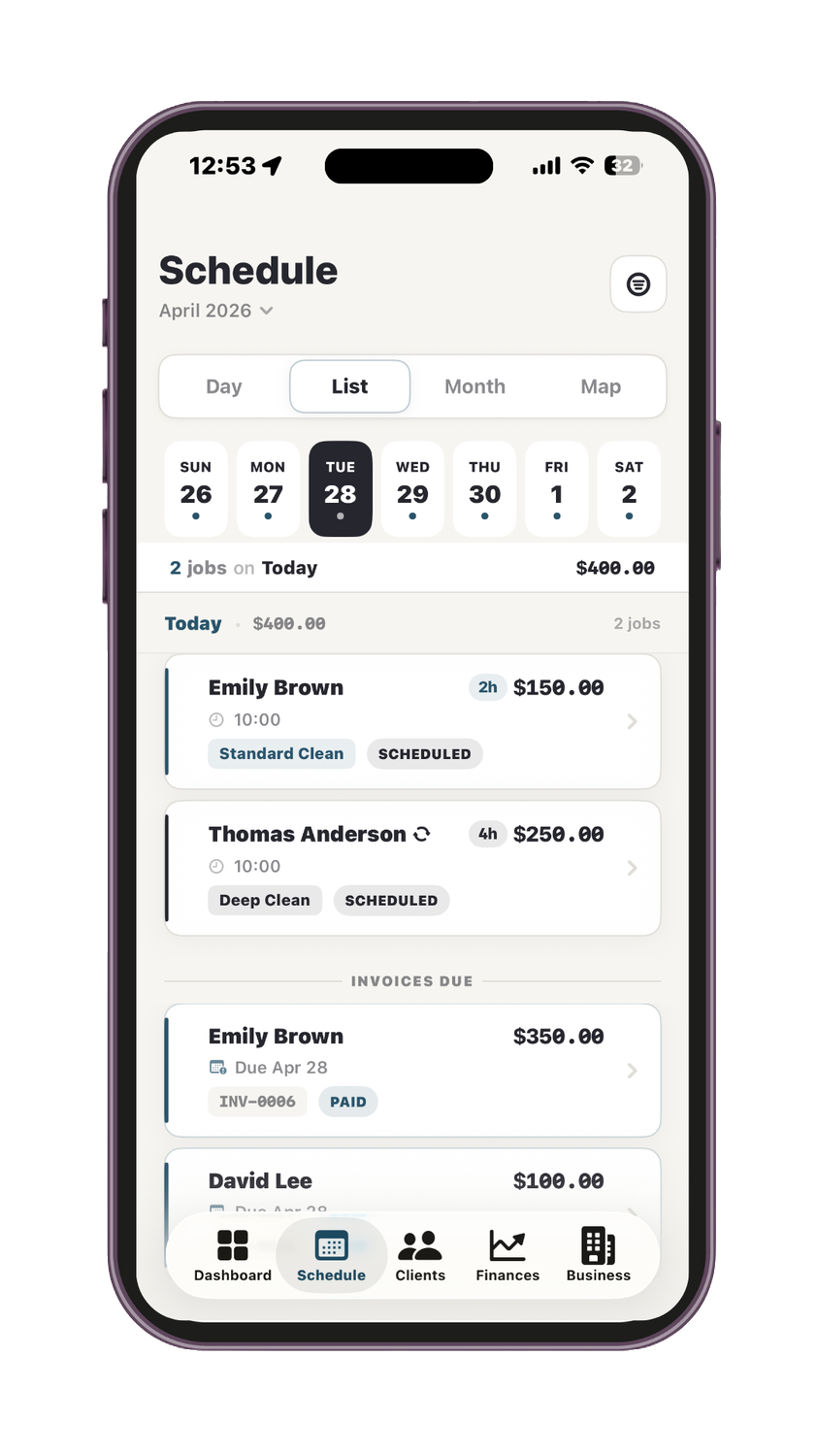 Scheduling, clients, invoicing, and team management — in one native iOS app. Built for cleaning pros.